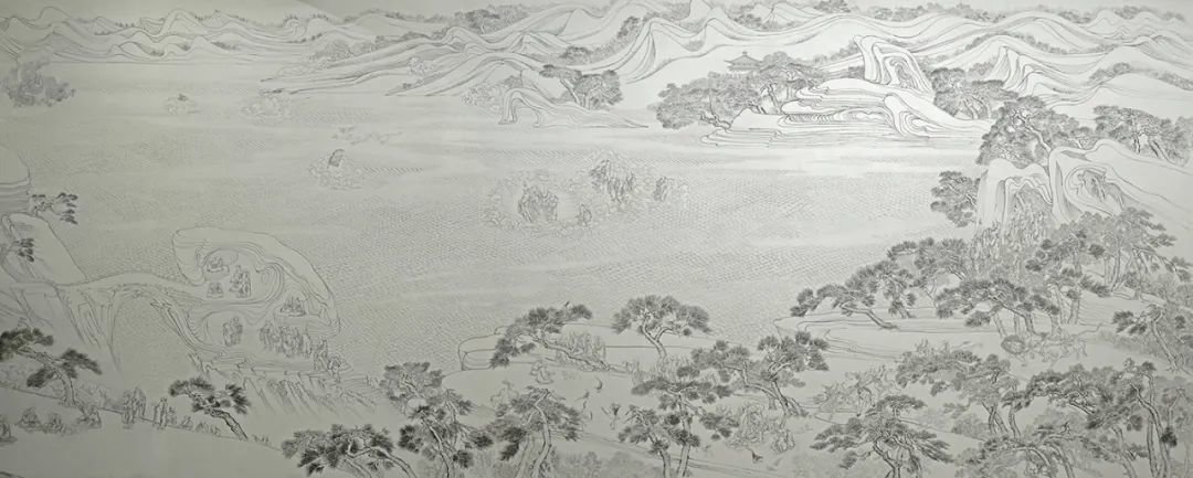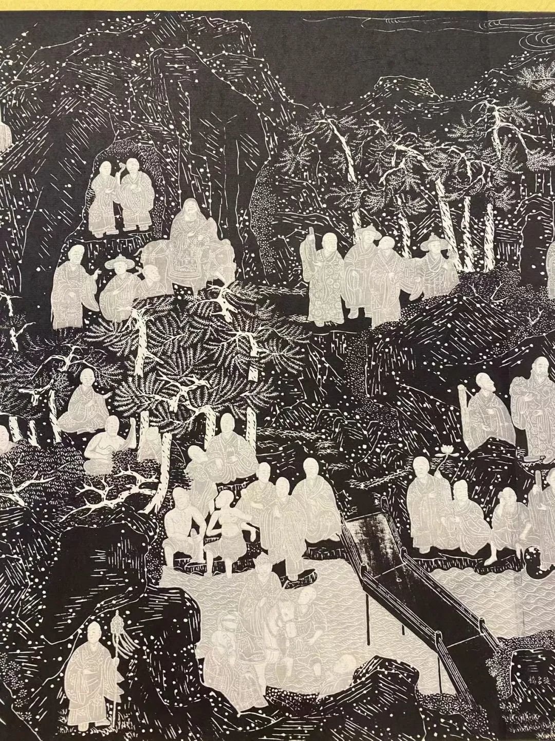 2020 年春夏,申古博在虎跑画室接到理海法师的电话,他说新修建好的大雄宝殿要画壁画,内容想画五百罗汉在山林中,这个主题令申古博一时没了头绪。恰逢午饭时间,戴建明与汪家琪两位老板招呼他去职工食堂吃饭,说北京来了一位朋友,大家一起聊聊天。来客是陈斌,清华大学吴良镛先生的博士,所以自然聊起了古建,又说到壁画。申古博就把将要创作清凉寺壁画的事告诉了大家,也表达了找资料无从下手的苦恼。说者无意,听者有心,陈博士说他有个朋友收藏着一本乾隆万寿山的长卷刻本,上面恰是五百罗汉在山林中的场面,也许对构思壁画有帮助。他回京后便去拜访朋友,随即邀请申古博和刘向红夫妇二人共同前往北京看原作。二人到北京后,经陈博士介绍,见到了收藏家王震先生,王震先生很大气,为他们展示了许多收藏。当看到乾隆万寿山石刻五百罗汉图时,二人受到很大震撼,全图长约 20 米,高 50-60 厘米,山水人物分组,具有极高的参考价值。二人把全图拍好后回到杭州,做成资料打印出来,开始学习、研究。