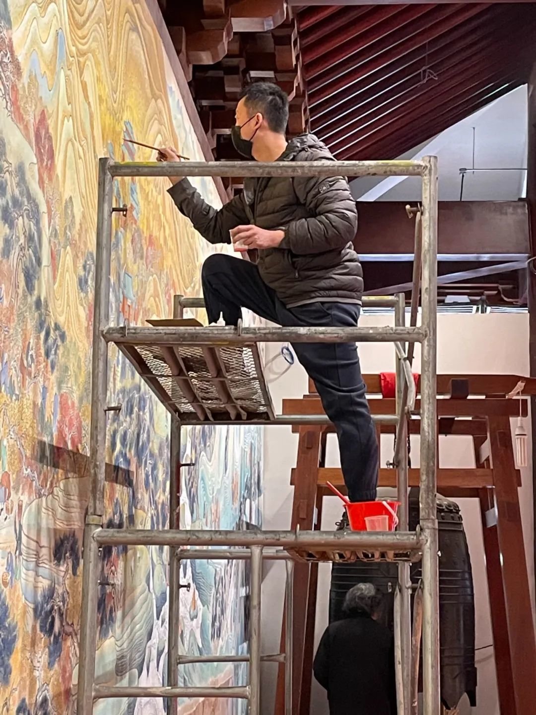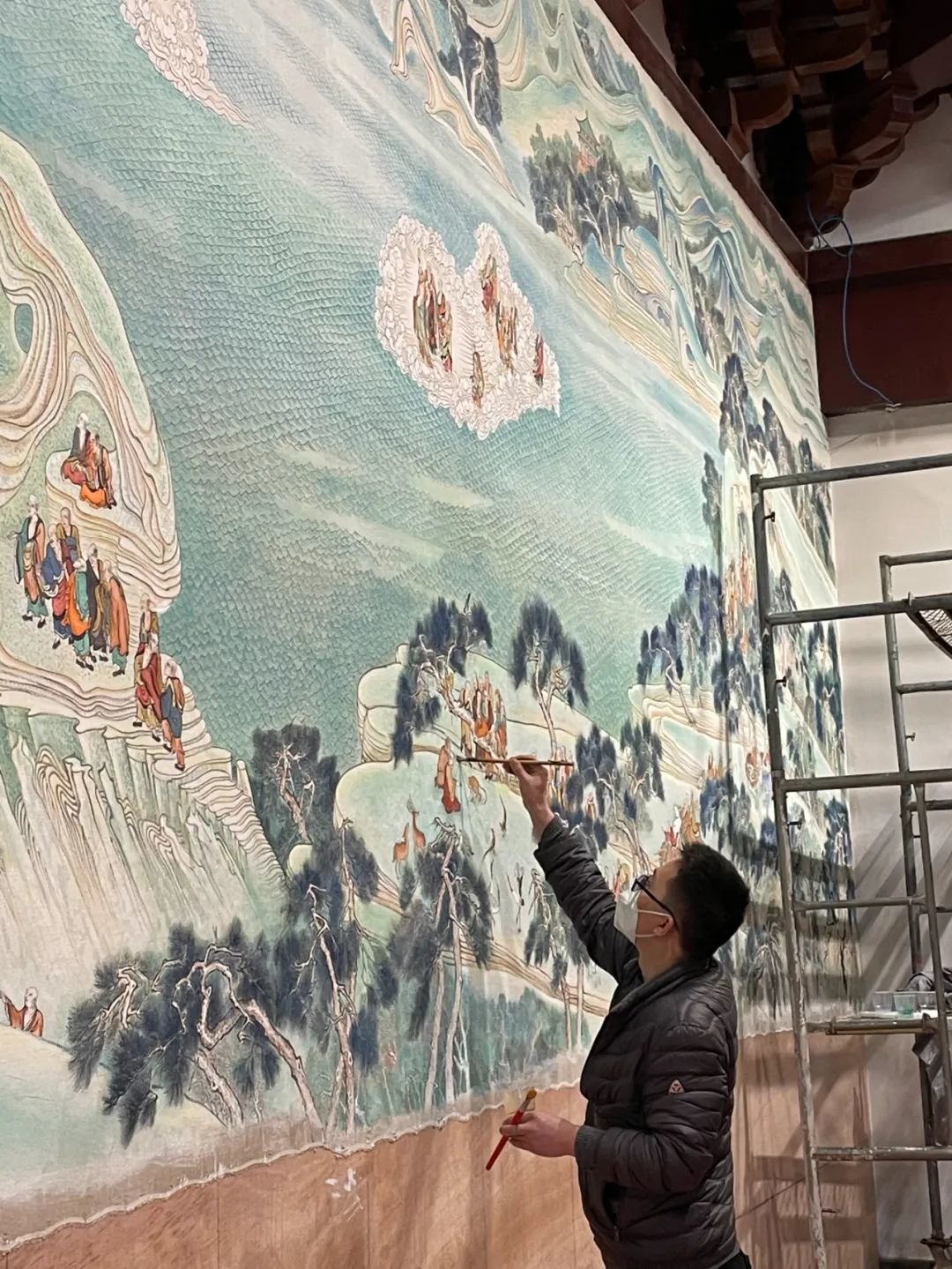 理海法师的设想给壁画的创作增加了难点,传统壁画形式多以满墙人物为主,空间感稍弱,并不适用于清凉寺,所以需要原创新的寺庙壁画样式。另外,创作壁画也要考量建筑内的装饰设计,包括色彩、造型、尺度等,使得最终呈现的壁画与建筑相得益彰。