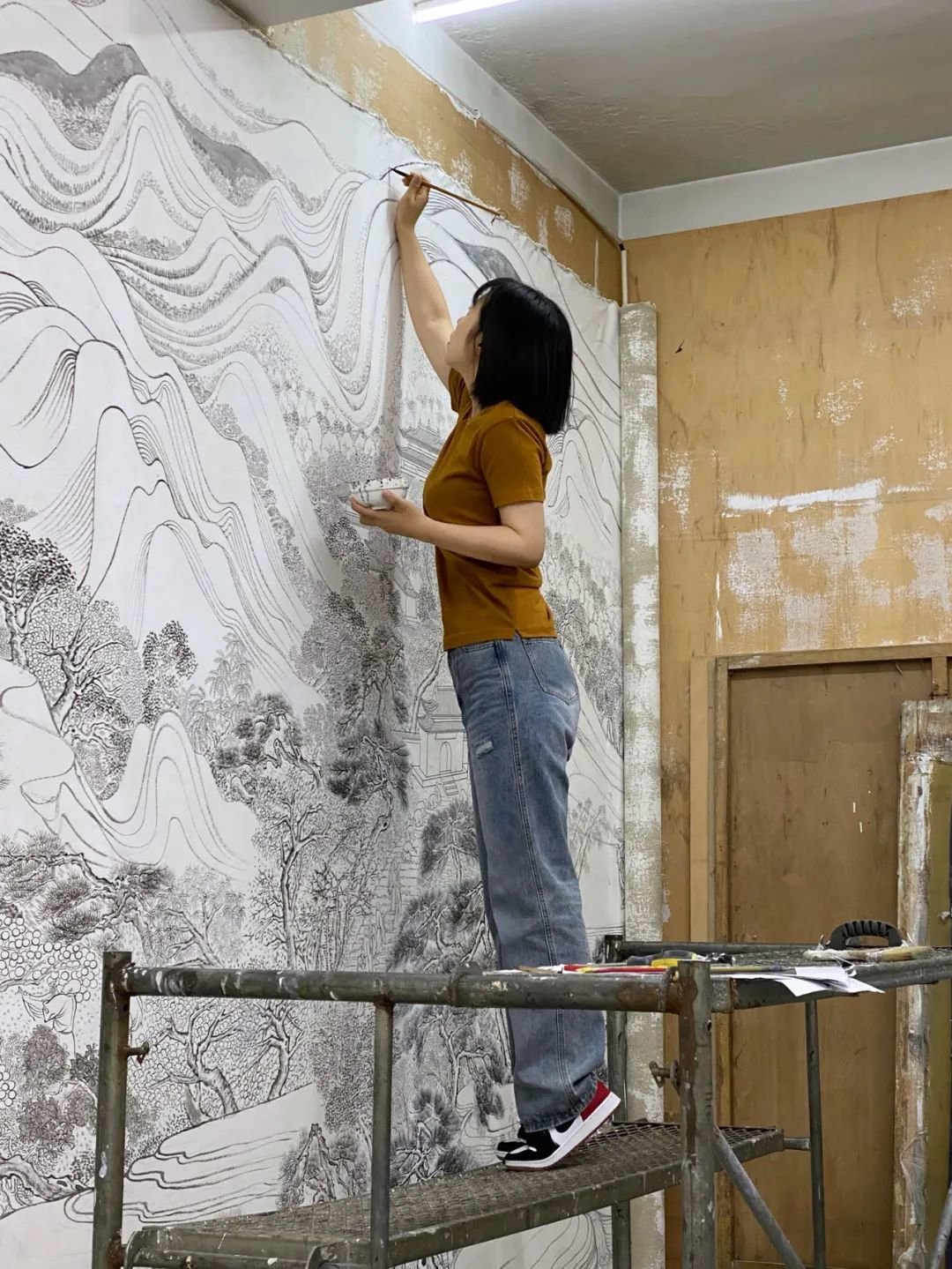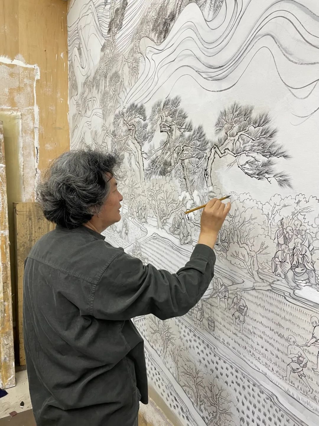 审稿、修改、再审稿,创作小稿确认通过,接下来开始制作上墙,这是真正壁画开始进入可以称为“工程”的阶段,因为壁画一般体量都不小,所以通常是由团队共同完成的。团队里的每个角色都要发挥自己的特长,尤其画家之间的相互配合特别重要,做到扬长避短,有效分工。