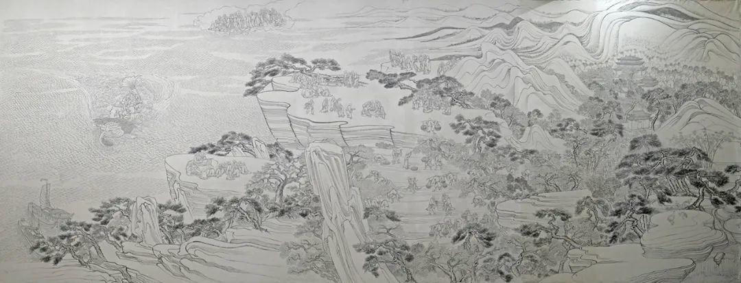 对壁画构图而言,整体气势要连贯,脉络清楚,每个季节过渡自然,细节丰富,山水与人物要协调。经过长时间思考与设计,两块画面的构图基本确定。