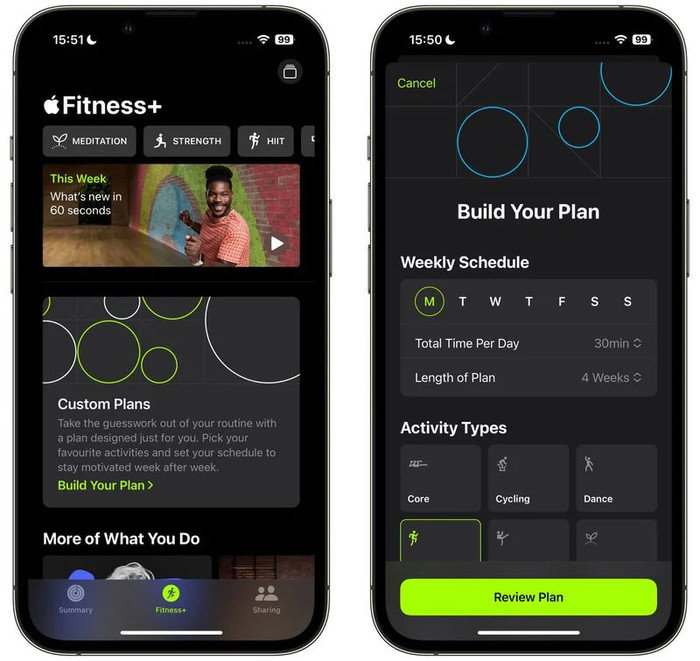 Fitness+中有一项名为“自定义计划”的新功能,各位用户可以在其中创建自己的每周锻炼和冥想计划,以增强自己的动力。