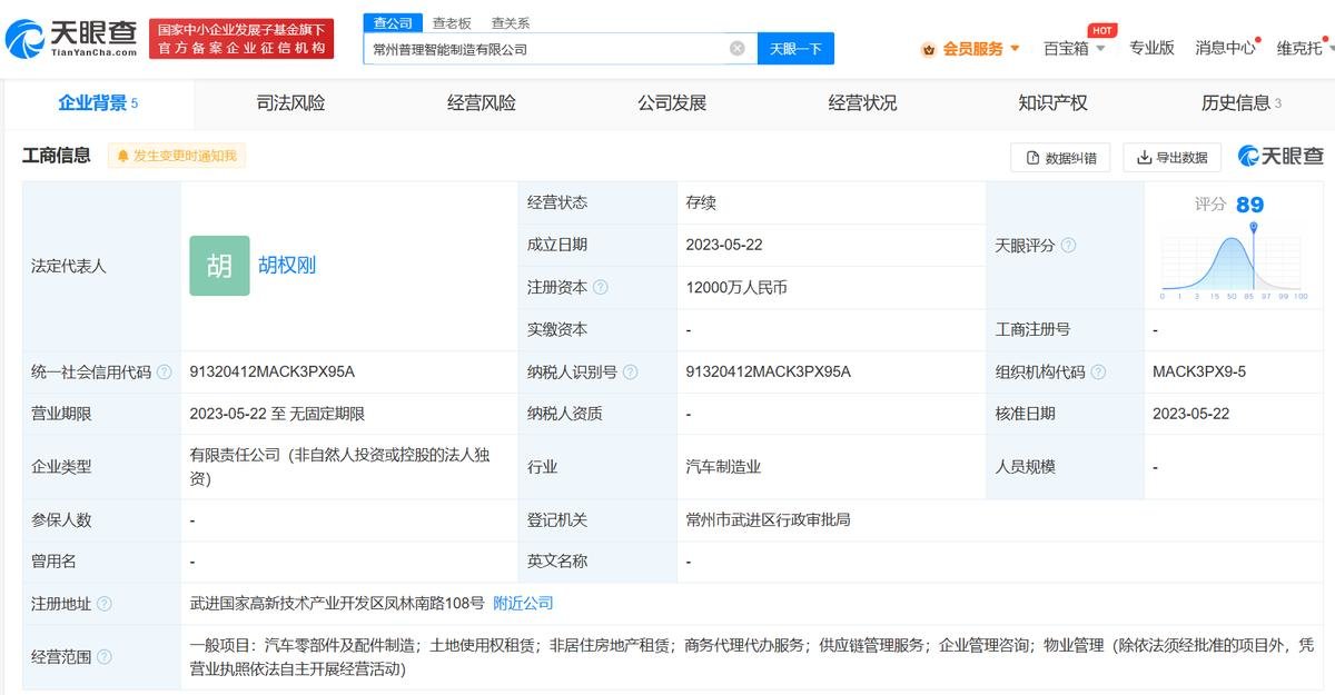 鞭牛士 6月7日消息,天眼查App显示,近日,常州普理智能制造有限公司成立,法定代表人为胡权刚,注册资本1.2亿人民币,经营范围包括汽车零部件及配件制造、土地使用权租赁、非居住房地产租赁、商务代理代办服务、供应链管理服务等。