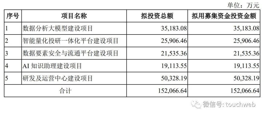 其中,3.52亿用于数据分析大模型建设项目,2.59亿用于智能量化投研一体化平台建设项目,2.15亿用于数据要素安全与流通平台建设项目,1.91亿用于AI 知识助理建设项目,5亿元用于研发及运营中心建设项目。