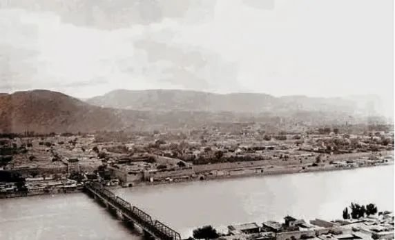 皮筏、水车与铁桥一道,共同构成了民国兰州黄河景观主题中“新”的核心要素,这是属于报刊特别是画报时代的黄河景观。其所以为“新”多少有些讽刺,民国兰州城建之落后几乎是一种全国之共识。外地人士首先注意到的是兰州之“古老”,因为“没有现代化的柏油马路,也没有立体形的建筑物”;能带来新鲜感的皮筏和水车,其实同样属于旧时代。只是在此前以诗歌为中心的题咏传统中,用典遮蔽皮筏、对仗无视水车,文体的纪律扼杀了景观的生机。有意思的是,当人们广泛接受由照片书写传递的景观信息之后,传统题咏也就可以书写那些曾被忽视的景观要素。抗战期间,近代诗词名家吴梅的弟子段天炯登上拂云楼,在这个“边塞感”曾经最为集中的经典观河点写下这样的句子:“第一桥头落日圆,望河楼边晚晴天。桥边日夜车轮转,汲取黄流灌石田。”拂云楼往黄河铁桥方向望去,能看到的水车系城市供水之用而非灌溉,此处进行了“嫁接”处理。无独有偶,拍摄于30年代的一幅照片几乎以相同视点、相同视角完美再现了此诗场景,题咏与摄影在此实现了和解。