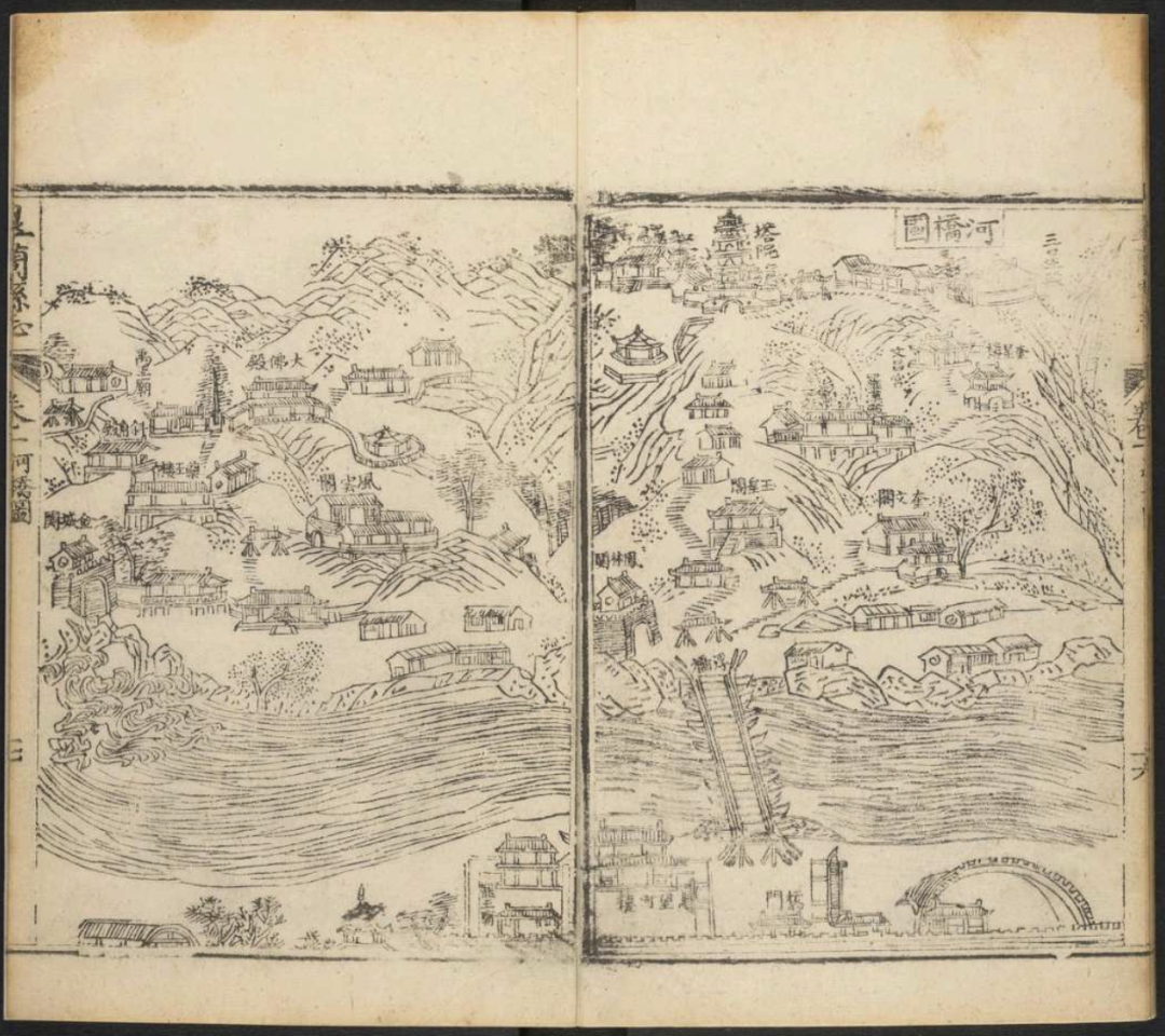 镇远桥附近黄河流速较快,尤其是桥址上游500米处有一天然险滩名为“白马浪”,因白浪翻涌、声如万马奔腾而得名。明代地方当局为减少浮桥所需舟船数量,曾几度将浮桥两端原本与河岸齐平的埠头向河心凸出展筑,从而使水势更趋湍急。不动之城与奔流河水之间的视觉张力构成审美体验的来源,唐人高适即从中汲取灵感创作“湍上急流声若箭,城头残月势如弓”的名句。明代营造活动进一步从实体上强化这种城—河之间的自然张力,奔流的河水与森严的关塞日益形成“互文”,明人诗文作品更加突出地体现出某种“紧张”气氛。在这个黄河作为帝国护城河的时代,“崇墉峻阪、铁索激流”成为兰州黄河景观实体的基本特征,在以“城—桥—关”为核心的区域通过营造活动形成“逼仄紧张”的视觉基础,景观主题的边塞性名副其实。