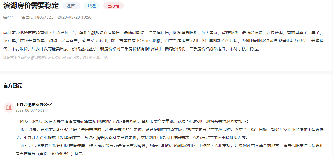 对此,6月7日,合肥市回复称,长期以来,合肥市始终坚持“房子是用来住的,不是用来炒的”定位,结合房地产市场实际,精准实施房地产市场调控,落实“三稳”目标;督促开发企业加快施工建设进度,引导开发企业根据开发建设成本、合理利润等因素科学合理定价;支持刚性和改善性住房需求,保持房地产市场平稳健康发展。