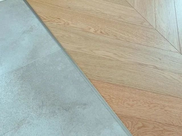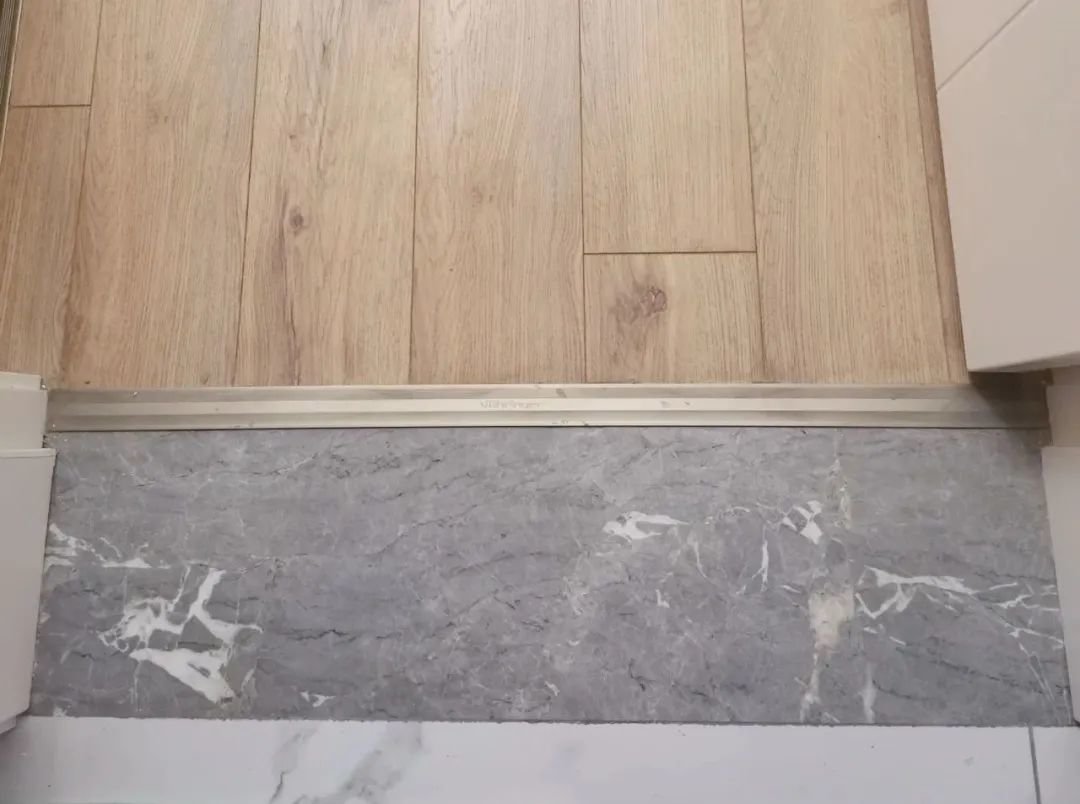 比如瓷砖-木地板之间,美缝剂与填缝剂都不适用,那么就可以在贴瓷砖的时候装一条T型压边条进去,然后木地板就卡在压边条下面,中间的缝隙就可以完美收口了。