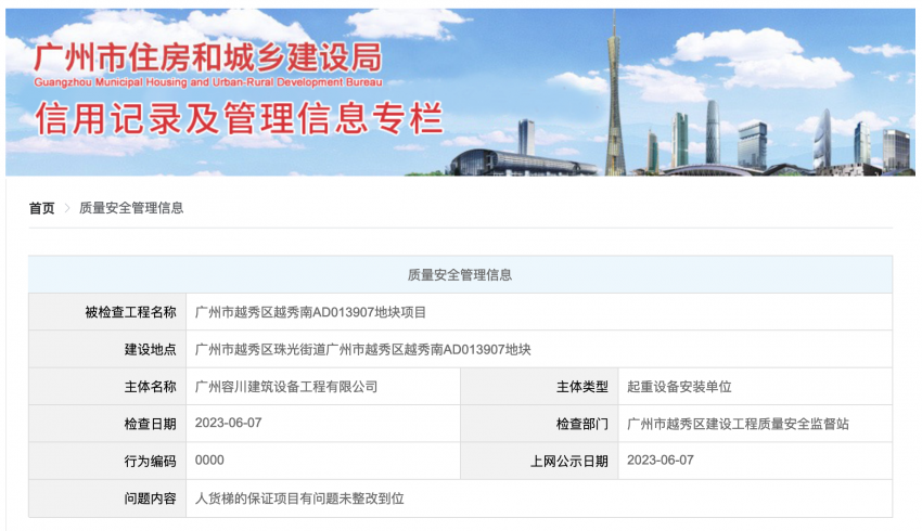 6月8日,广州市住房和城乡建设局信用记录及管理信息专栏公示广州市越秀区越秀南AD013907地块项目质量安全管理信息,公示内容指出项目存在“人货梯的保证项目有问题未整改到位”等问题。