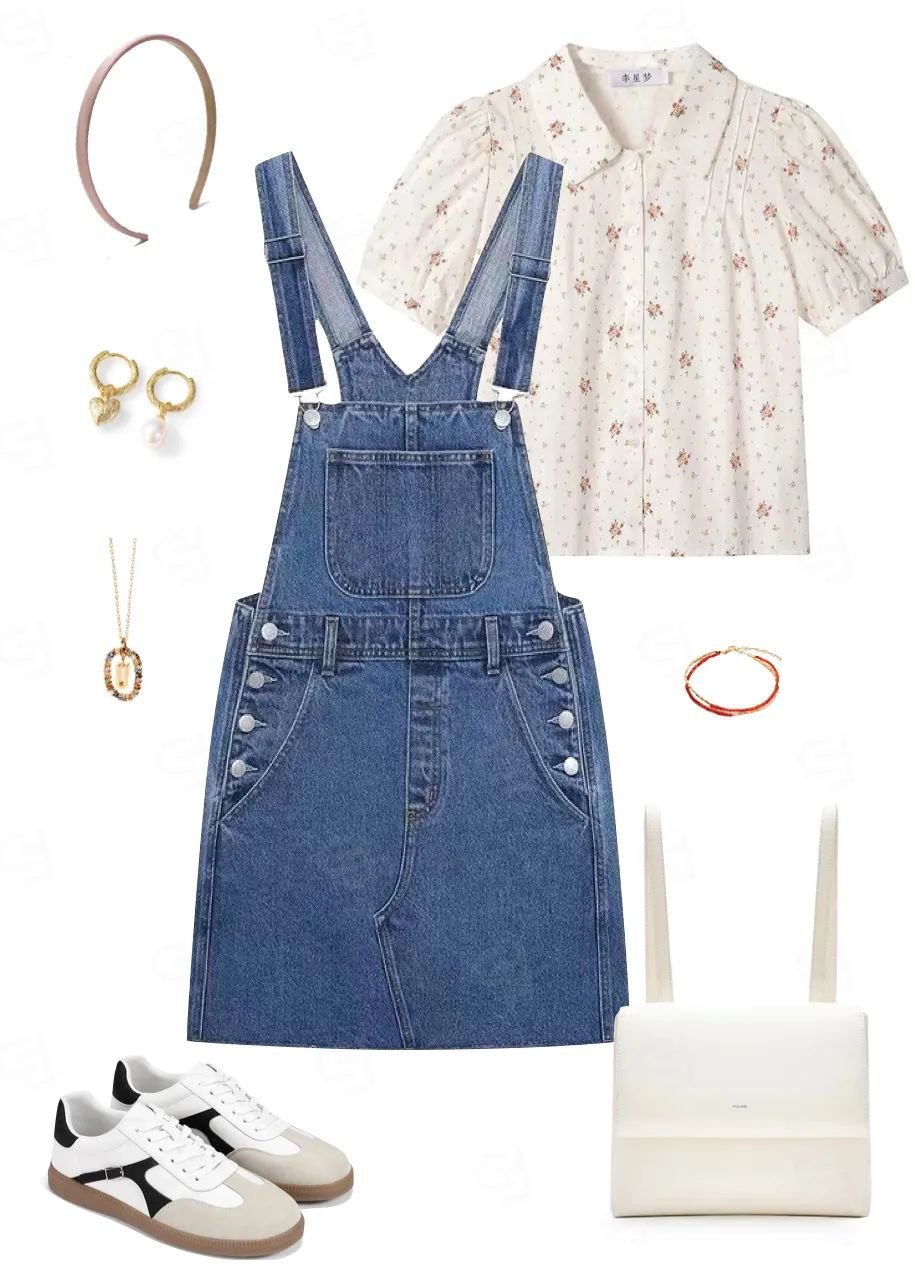 小碎花衬衫+牛仔背带裙的搭配,永远是乖巧俏皮的代名词!