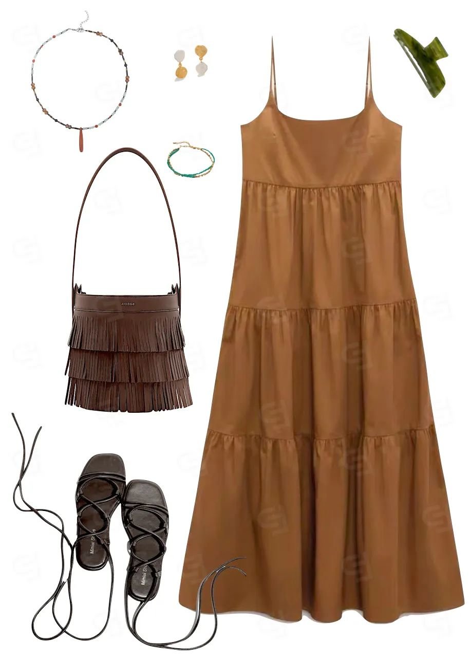 流苏包包和绑带的平底凉鞋,都有一种野性之美,我还选了同色系来增强搭配的层次感。