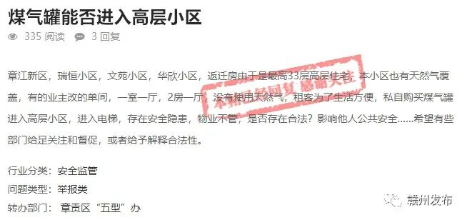 接到投诉后,章贡区住建局、章江街道腊长村委会、水南街道办事处工作人员第一时间与小区物业联系核实,小区物业工作人员表示后续他们将加强管理,并进行整改:一是依据于2023年6月1日实施的《建筑防火通用规范》(GB-55037-2022,自2023年6月1日实施)第12.0.4条,在高层建筑内不应使用瓶装液化石油气,已督促燃气经营企业停止对高层建筑内用户提供送气服务,后续,物业将加强对瓶装液化气的管控,禁止进入高层建筑内。二是物业将加强巡查,禁止村民住户携带液化气罐进入小区。三是若发现小区住宅内有使用瓶装液化气情况,请各位业主(住户)及时进行劝阻,也可告知物业,或上报相关部门。