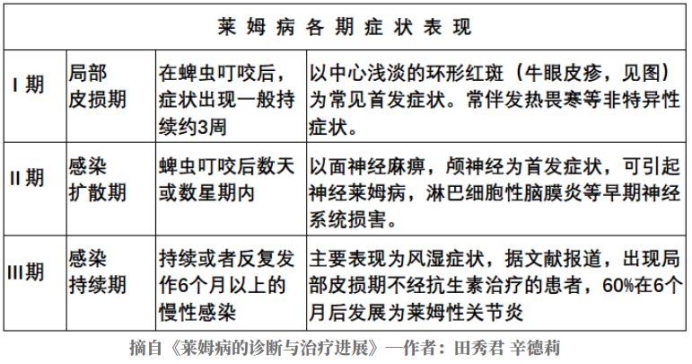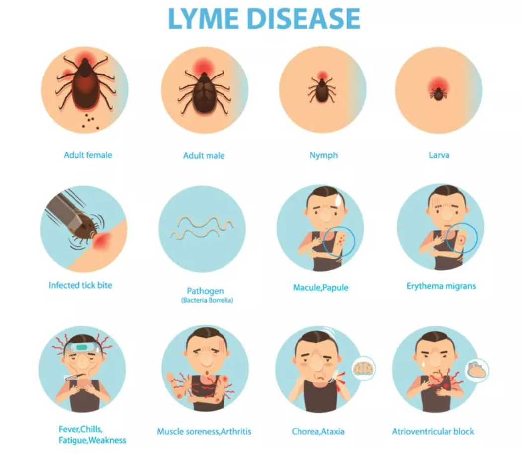 一旦被携带伯氏疏螺旋体的蜱虫叮咬,大多数人会在7天内发病,最晚不超过1个月。紧接着,病人还将经历早期、播散期、病变持续期三个病程。