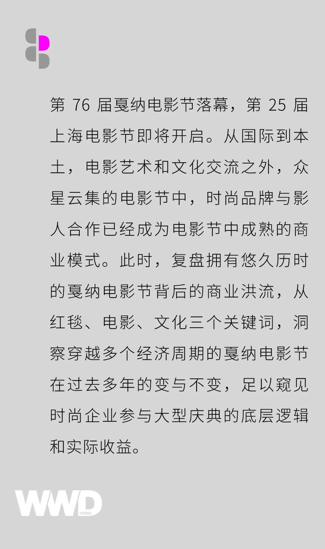 曾多次亲历戛纳电影节的中国第一代时尚媒体人、著名服装设计指导黃薇,担任了众多爆款影视剧的艺术总监。她在接受 WWD China 专访时表示:对比以往,今年的戛纳有许多变与不变。不变的是,在过去二三十年都是明星+品牌的组合,这已经成为成熟的商业模式。也都会出现没有作品但是借助戛纳电影节的影响力努力出现在红毯。而变化是以往信息传播并没有今天这样及时,摄影作品的后期也没有今天这样发达,所以看起来今年的戛纳比以往更热闹。但其实,还是熟悉的“配方”。