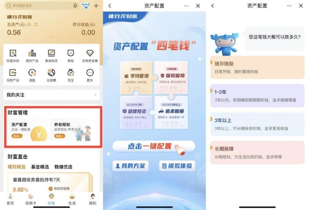 建设银行此前在财报中表示,将这项服务纳入为其财富管理中“普惠”的一环,通过“零钱管理、保险保障、稳健投资、追求回报”四笔钱精准识别客户需求,提供与之匹配的资产配置方案和财富管理产品。