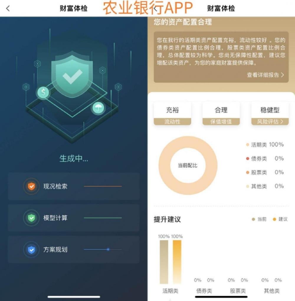 测评结果显示,农业银行APP的财富体检功能、工商银行APP的资产诊断功能设置均比较简单,基于客户风险评估及在其银行当前的资产等作出对应评估和建议。依据客户风险评估结果,可在此页面的推荐产品中购买对应的理财产品,而其提供的理财产品也主要以银行理财为主。