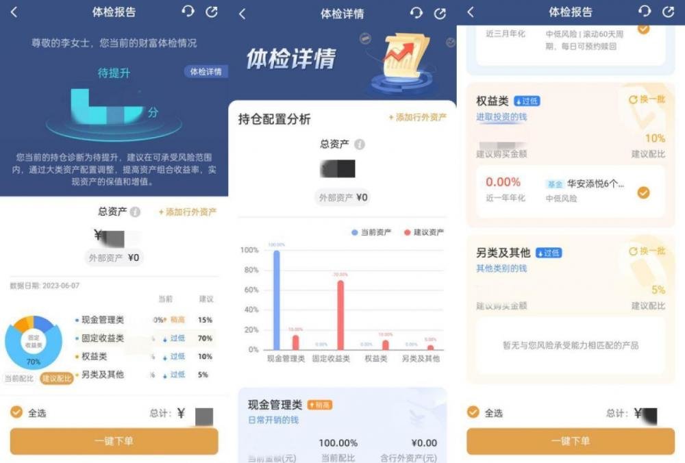 从实际体验来看,邮储银行财富体检功能将持仓资产划分为现金管理类、固定收益类、权益类、另类及其他四类,在“体检报告”中提到了以上四类分别对应日常开销的钱、稳健投资的钱、积极进取的钱、其他类别的钱,并对各类产品提出建议配比等。