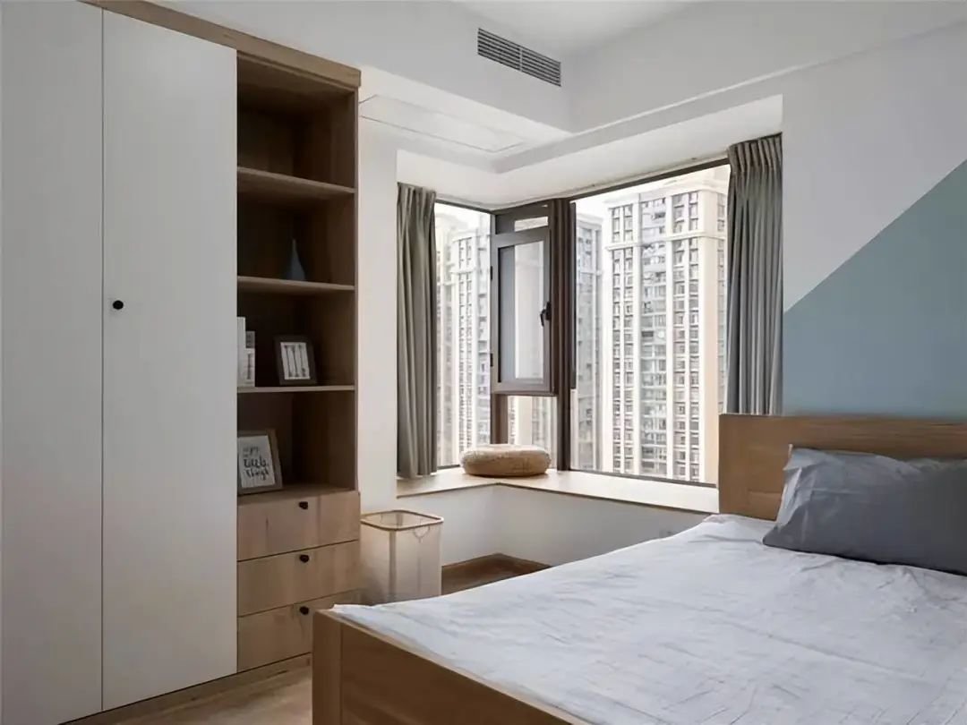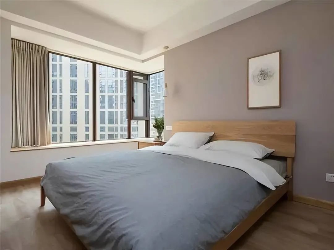 主卧温暖的日式木床,舒适的棉麻被褥,金色薄纱般的阳光,汇聚成一种宁静的温柔,让人依恋。全景飘窗适合午后小憩、沐浴阳光,晚上也适合观赏城市千家万户的灯光。