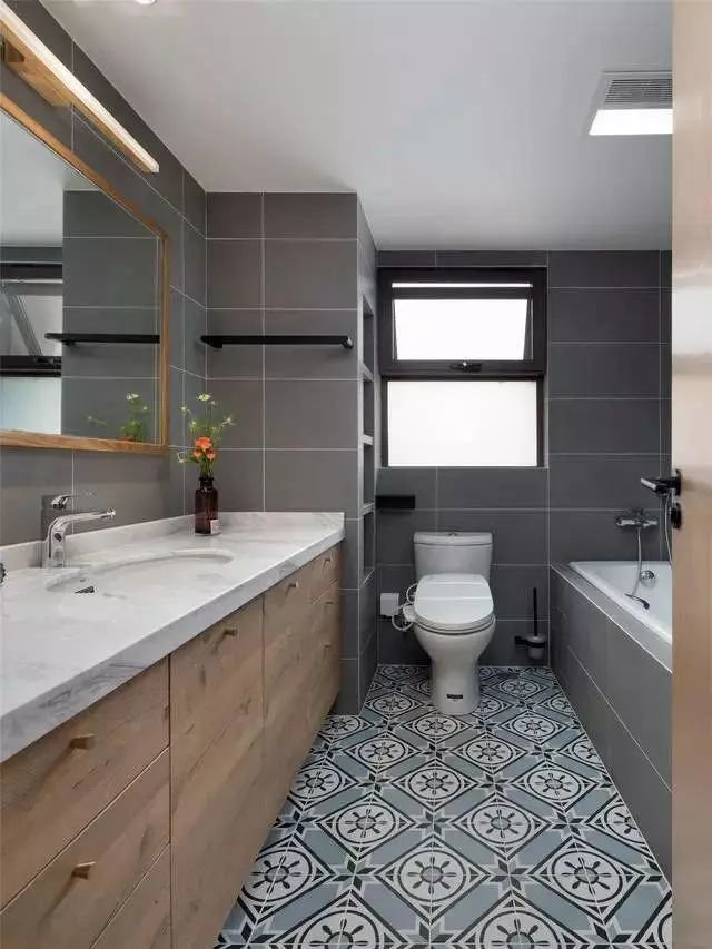 由于业主想在卫生间放一个浴缸,虽然原来的空间不小,但不是很宽敞,所以设计师优化了空间布局,将其改为H形布局,放下浴缸,使空间利用率最大化。被提升到极致。