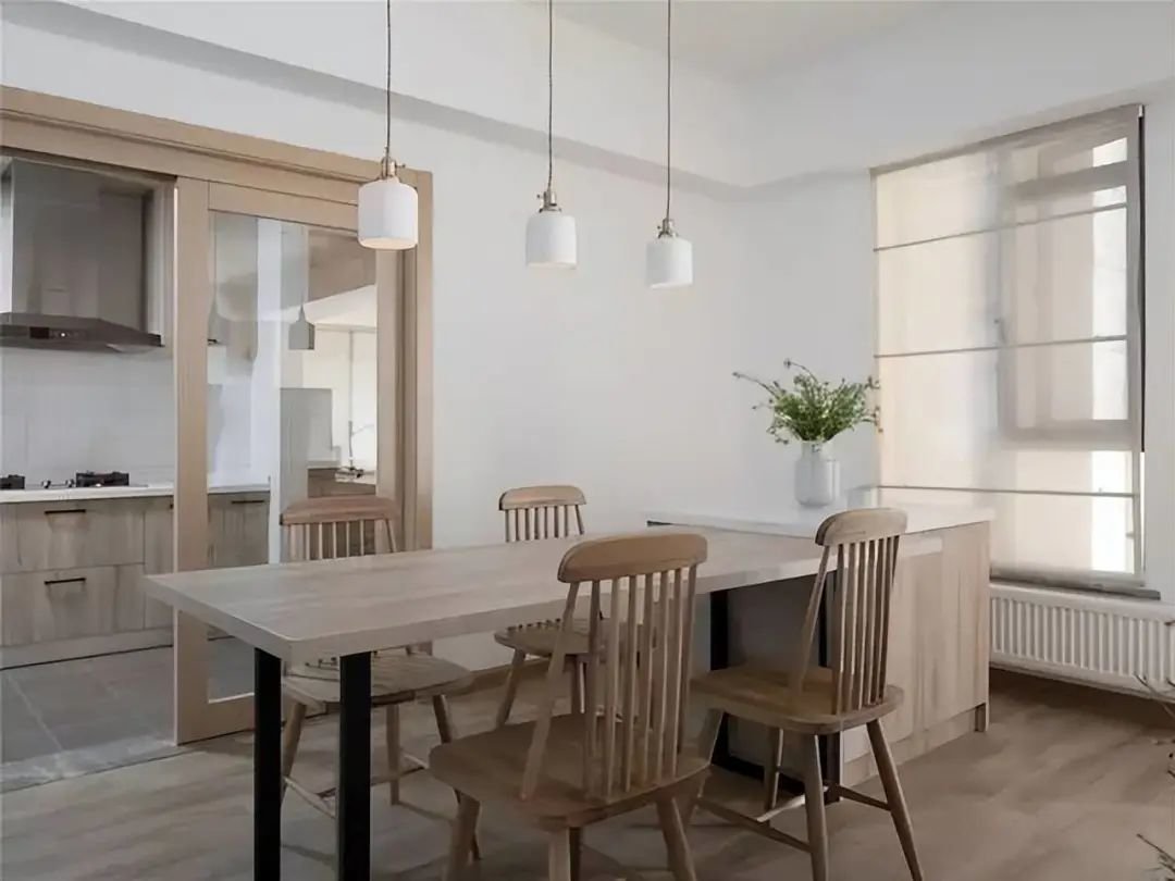 餐厅制作的组合餐桌和橱柜,餐桌延伸到吧台,3盏简单的吊灯不仅起到装饰作用,还用温暖的灯光营造了良好的用餐环境。