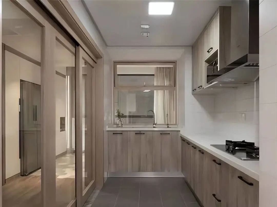 安装在厨房的玻璃推拉门增加了这个空间的采光,让这个小空间看起来不会有封闭的感觉。