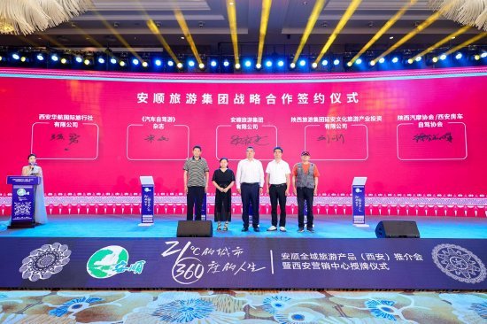 随后安顺旅游集团分别与陕西旅游集团延安文化旅游产业投资有限公司、西安华航国际旅行社有限公司、《汽车自驾游》杂志、陕西汽摩协会/西安房车自驾协会四家企业签订战略合作协议,并授予西安华航国际旅行社有限公司为安顺旅游集团西安营销中心。