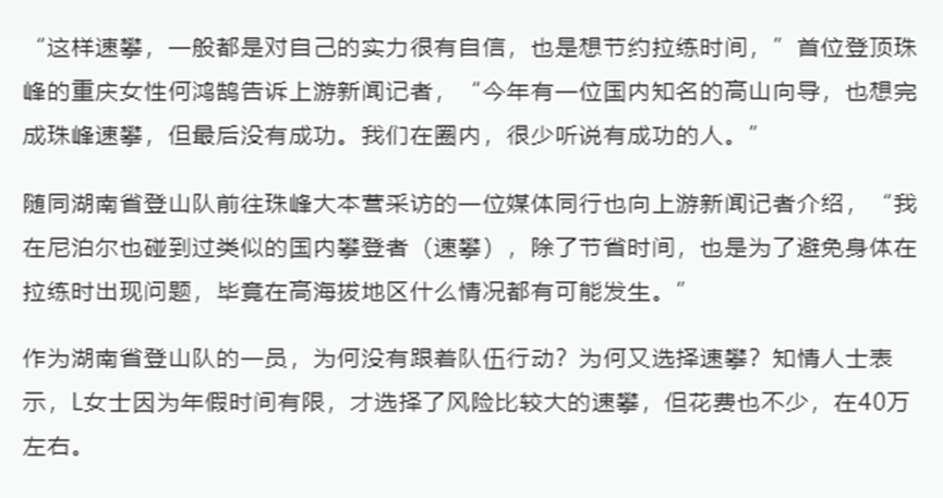 陈春石 :真正的速攀是指最后一次冲顶时采用很快的速度,比如从大本营出发,登顶再返回大本营,一般的客户需要花四五天时间,速攀的人可能用十几个小时就完成了。进行速攀冲顶之前会花上几十天的时间进行反复的海拔适应训练。根据现有信息来看,救人争议事件中的获救者L女士应该不算是速攀。她在珠峰地区进行高海拔适应的时间比较短,一般人会花四五十天在珠峰地区进行高海拔适应,而她总共只用了十几天,据说是因为她没有这么长的假期待在尼泊尔。但为她服务的公司针对性地安排她在青海的玉珠峰提前进行了高海拔适应,以提升她的血红蛋白水平。一般来说,血红蛋白水平涨上去之后会在回到平原后的两周左右回落,只要两周之内再去到高海拔地区,身体也是能适应的。