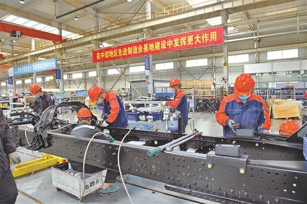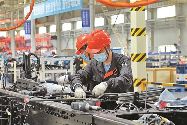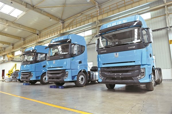 6月8日,在吉利汽车晋中基地甲醇重卡生产车间内,工人正在汽车生产线上工作。近年来,晋中市以新能源汽车、绿色甲醇为竞逐赛道,升级晋中新能源汽车产业园区,建设国家级甲醇经济示范区,打造新能源汽车产业新地标。(记者 杨洋 摄)