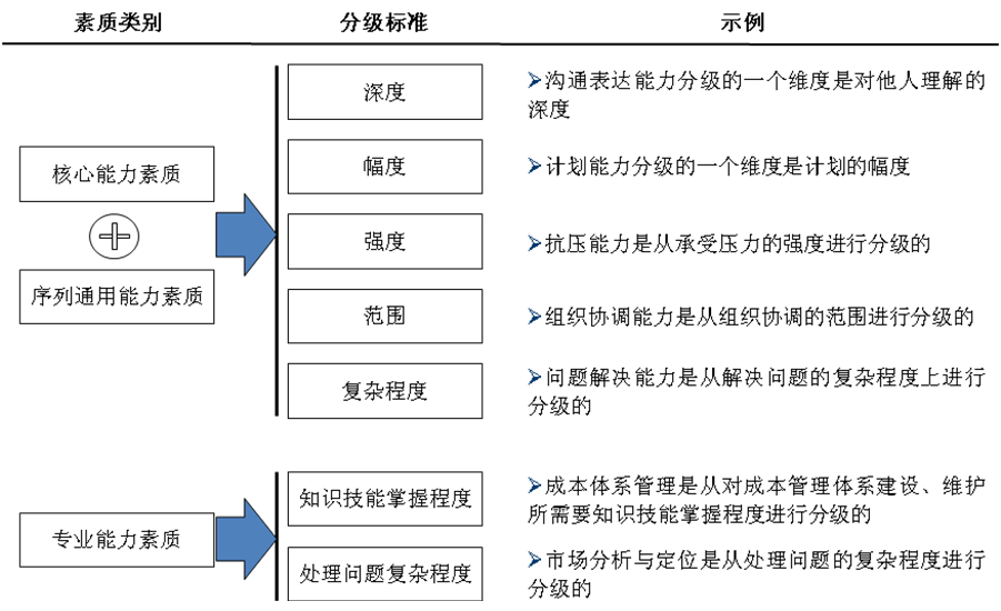 根据能力素质的特点在行为的深度、幅度等标准中选择最适合的分级标准对能力素质要素进行分级描述。
