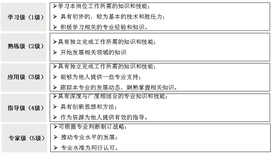 一般而言,将能力素质级别划分为至少1~5级,显示该胜任特征的强度复杂性等特性的程度。如下图所示: