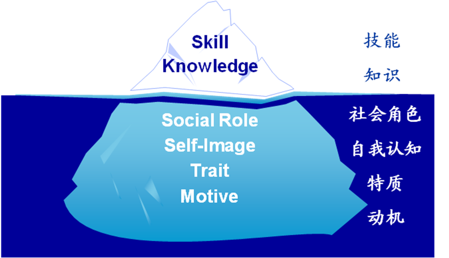 在能力素质层次中,知识、技能具有显性的特征,可以被直接观察和研究,好比冰山浮出水面的那部分,一直为人力资源管理者所关注。而社会角色、自我认知、特质、动机好比冰山潜藏于水下的部分,具有隐性特征,往往容易被忽略。近来的研究发现,能够有效区分高绩效与一般绩效者的关键因素正是这些隐性特征。