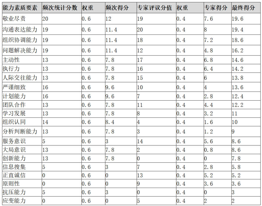 根据目前广泛应用的21项能力素质(原则性、主动性、大局意识、敬业尽责、严谨细致、团队合作、组织认同、服务意识、正直诚信、抗压能力、应变能力、沟通表达能力、问题解决能力、执行力、人际交往能力、计划能力、团队合作、学习能力、分析判断能力、创新能力、信息搜集能力)为基础,建立能力素质库,作为调查问卷的依据,对每个岗位进行问卷调查,然后根据各序列包含的岗位进行归类,通过各序列能力素质要素频次统计、专家评议排序加权平均可以初步确定各序列的通用能力素质,最后将最终得分前五个能力素质作为该序列的通用能力素质。以人力资源管理序列为例,见表2。该序列的通用能力素质为敬业尽责、沟通表达能力、组织协调能力、提解决能力和主动性。
