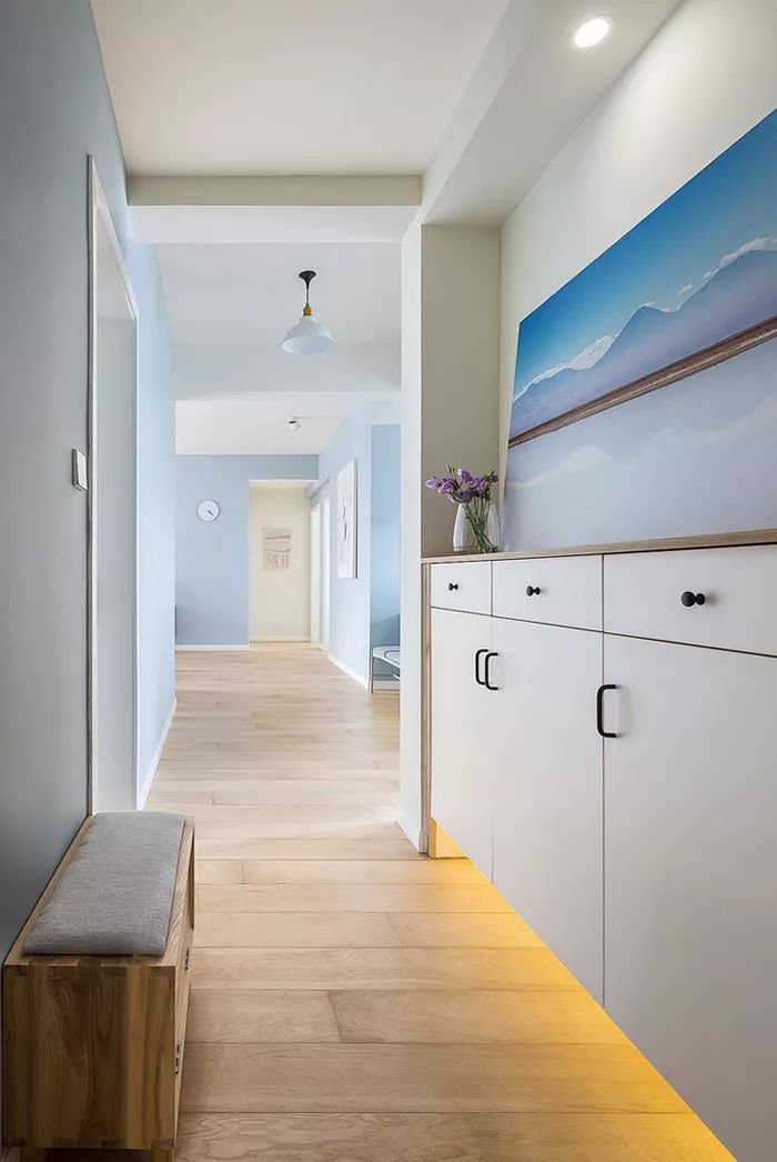 ▲推开大门,淡蓝色的墙面空间映入眼帘,给人一种清新简约的氛围感。玄关左侧摆一张换鞋凳,右侧靠墙是一个定制鞋柜,鞋柜带有抽屉设计,鞋柜底部留空加入暗藏灯带,并在鞋柜台面上摆上装饰画、蓝色山湖图案的装饰画,让空间显得更有文雅的设计感。