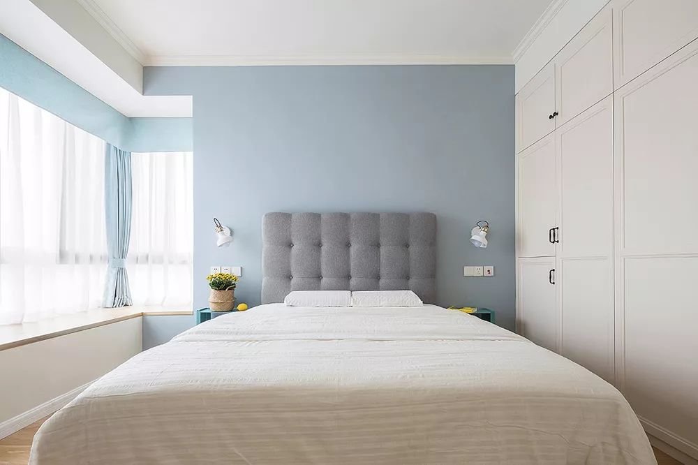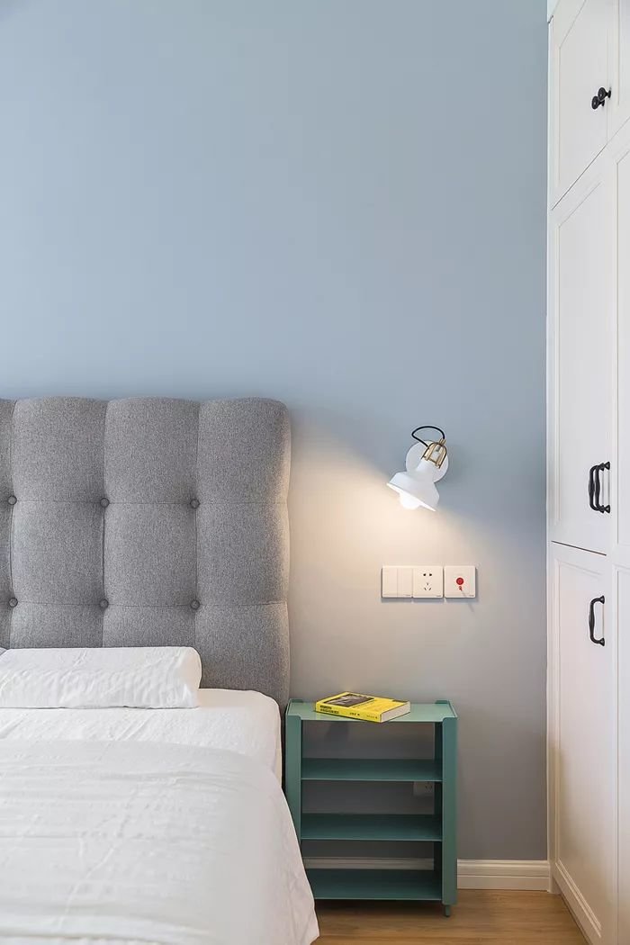 ▲卧室墙面也是以淡蓝色的基础,布置灰色床铺+白色床单,左侧是L字形的飘窗,右侧是白色带浮雕的衣柜,简简单单的卧室布置,为主人布置了一个轻松舒适的睡眠休息环境。