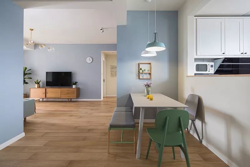 乳胶漆的空间,最是显得简单,在这套130平米的房子里,就是采取以木地板+乳胶漆的空间搭配,采取淡蓝色墙面的空间为主,布置简约舒适的家具,文艺清新的绿色,使得居住空间充满轻松惬意的简约舒适感。