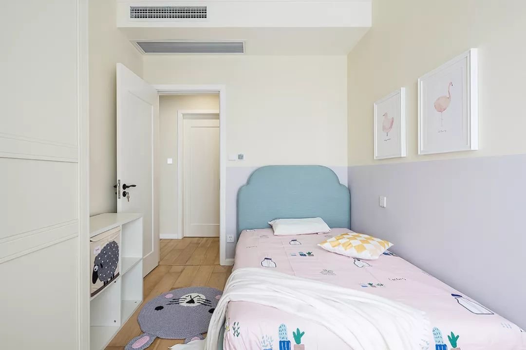 ▲儿童房墙面是淡紫色墙脚+米黄色墙身的组合,温馨淡雅的墙面空间,床铺靠卧室门摆上,铺设粉色带卡通图案的床单,另一侧靠墙安装一个+矮矮开放柜格,让空间显得格外的活泼温馨而可爱。