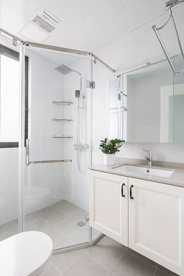 ▲卫生间在暖灰色地砖+白色墙砖,马桶、淋浴房与洗手盆是三角分布的设计,小小的空间却也显得实用方便;洗手盆柜悬空吊装,台面摆一盆绿植,上方一个镜柜设计,让卫浴空间显得实用而清新。