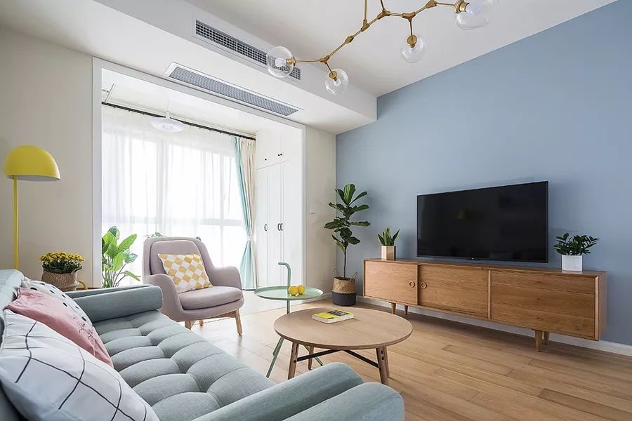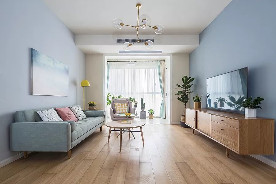 ▲整个客厅墙面蓝色+浅木色地板,布置简约舒适的沙发、茶几等家具,还有绿植与精致的软装点缀,在自然光线的烘托下,让空间显得格外的轻松舒适。