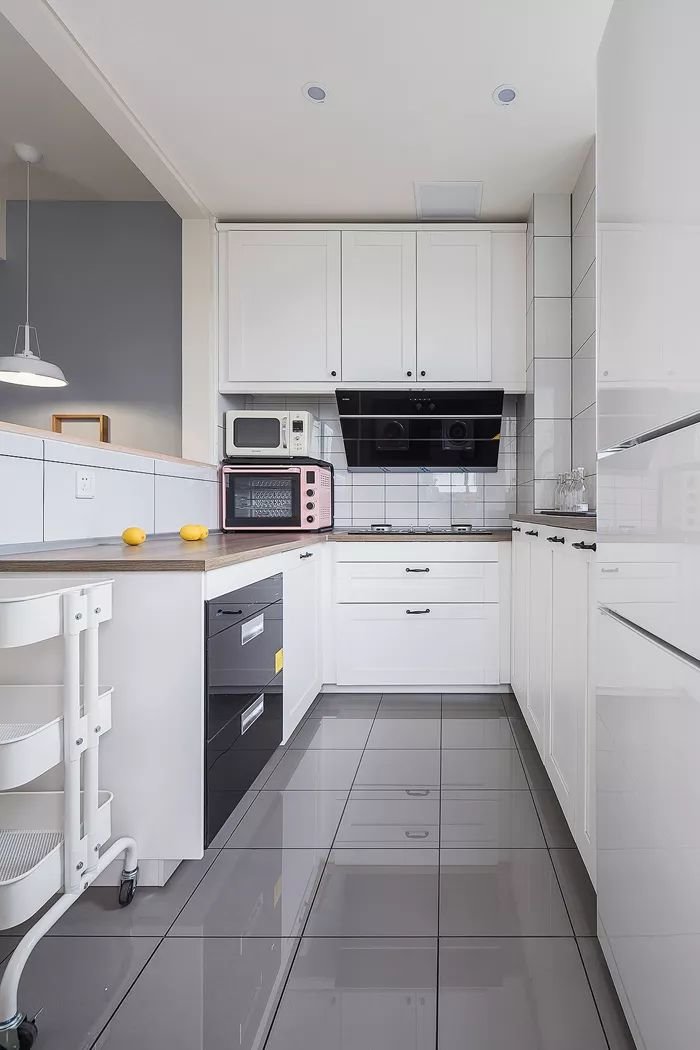 ▲灰色地砖+白色墙砖,装入白色橱柜的设计,再加入一个移动式收纳架,让做饭空间更加实用而文艺清新。