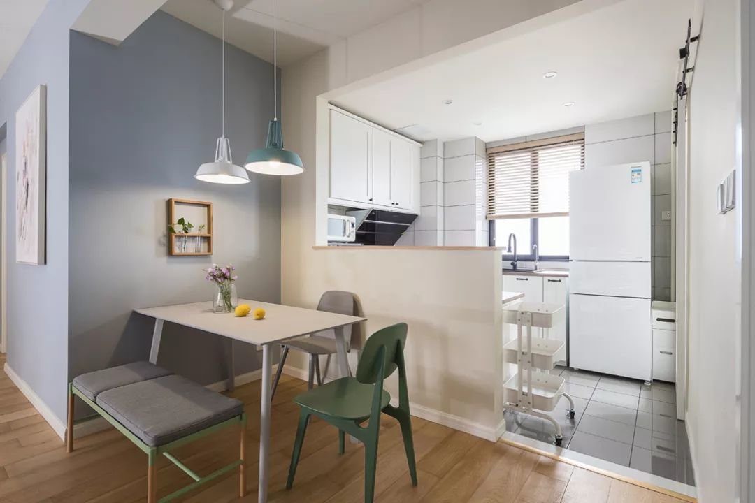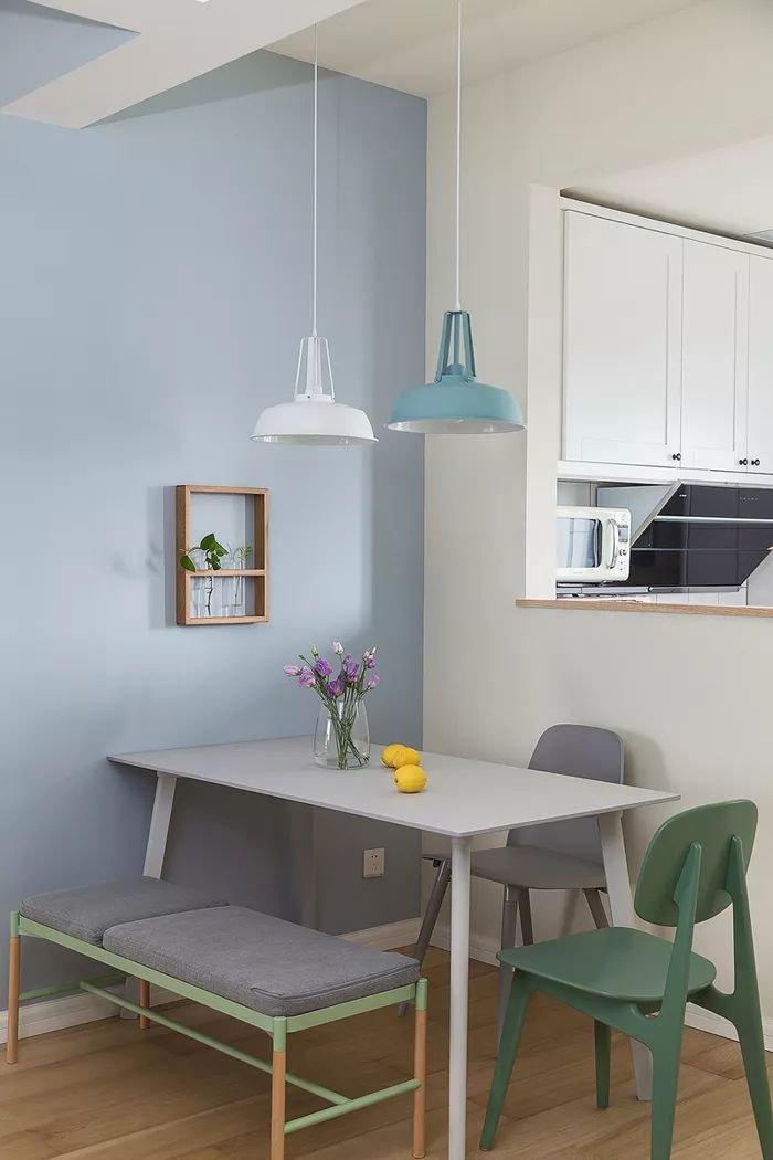 ▲餐厅的与客厅保持一致的木地板+蓝色乳胶漆墙面,靠墙布置餐桌,搭配上板凳与塑胶质感的餐椅,地面墙面木地板,餐台上方装上淡绿色+白色的吊灯,让用餐氛围显得格外的文艺精致。