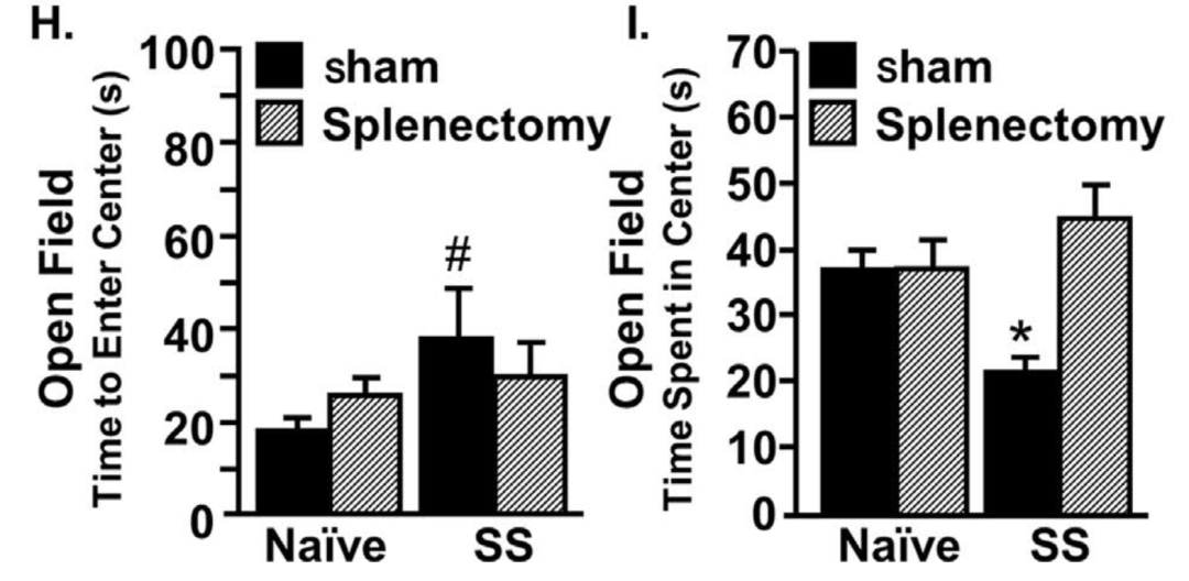 矿场实验中,脾切除小鼠(Splenectomy)在应激后焦虑症状减轻