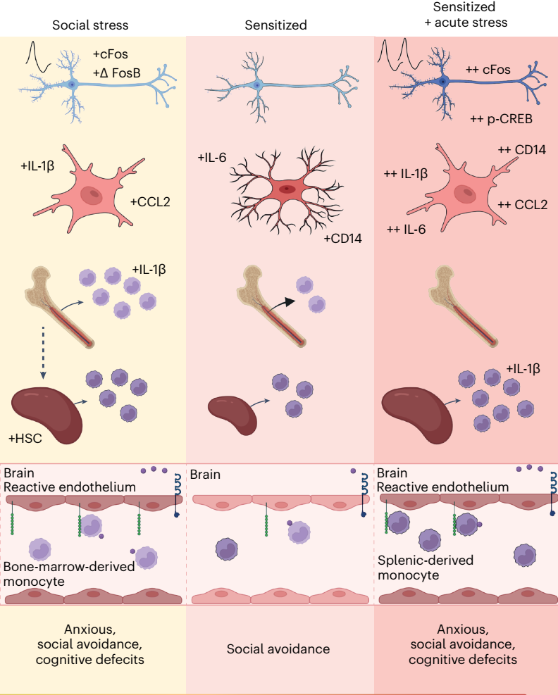RSD之后,小胶质细胞能通过产生CCL2促进CCR2+Ly6Chi单核细胞向大脑募集,是导致精神障碍加重的关键因素。