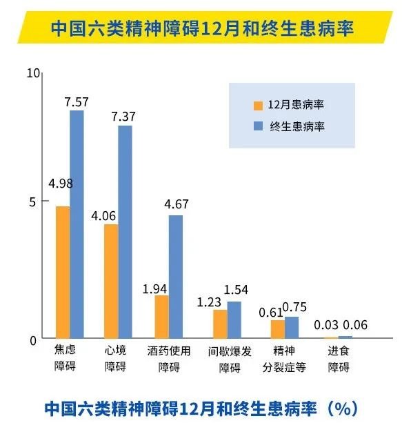 2021年9月,《Lancet psychiaty》杂志发表了一篇首次对我国首次成人精神障碍流行病学调查的文章。调查结果结果中,我国多类精神性疾病的长时间患病率均处于较高的水平。(《Prevalence of depressive disorders and treatment in China: a cross-sectional epidemiological study》,北京大学第六医院黄悦勤教授团队)