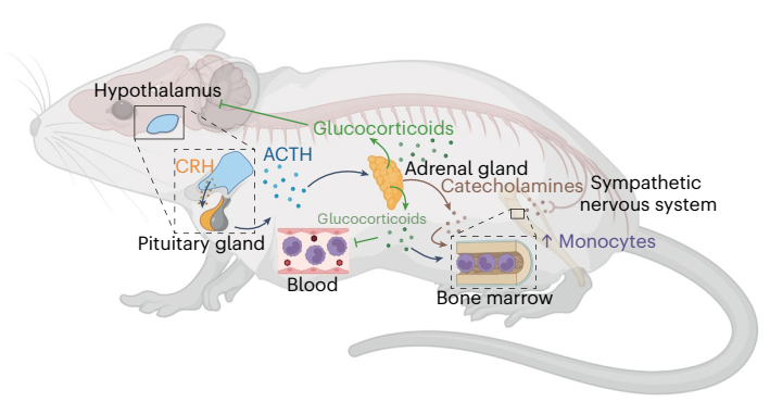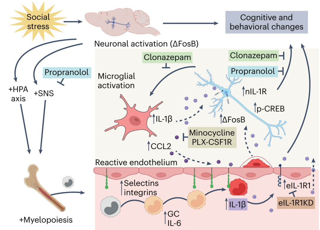 RSD之后,免疫系统会激活HPA轴产生糖皮质激素调节免疫反应。但这类细胞会造成糖皮质激素抵抗,并通过产生IL-1β使促炎细胞因子的产生和释放进一步增加,加强了应急之后的焦虑样表现,同时增加了循环中IL-6的表达水平。相当于炎症和精神障碍的“放大器”。