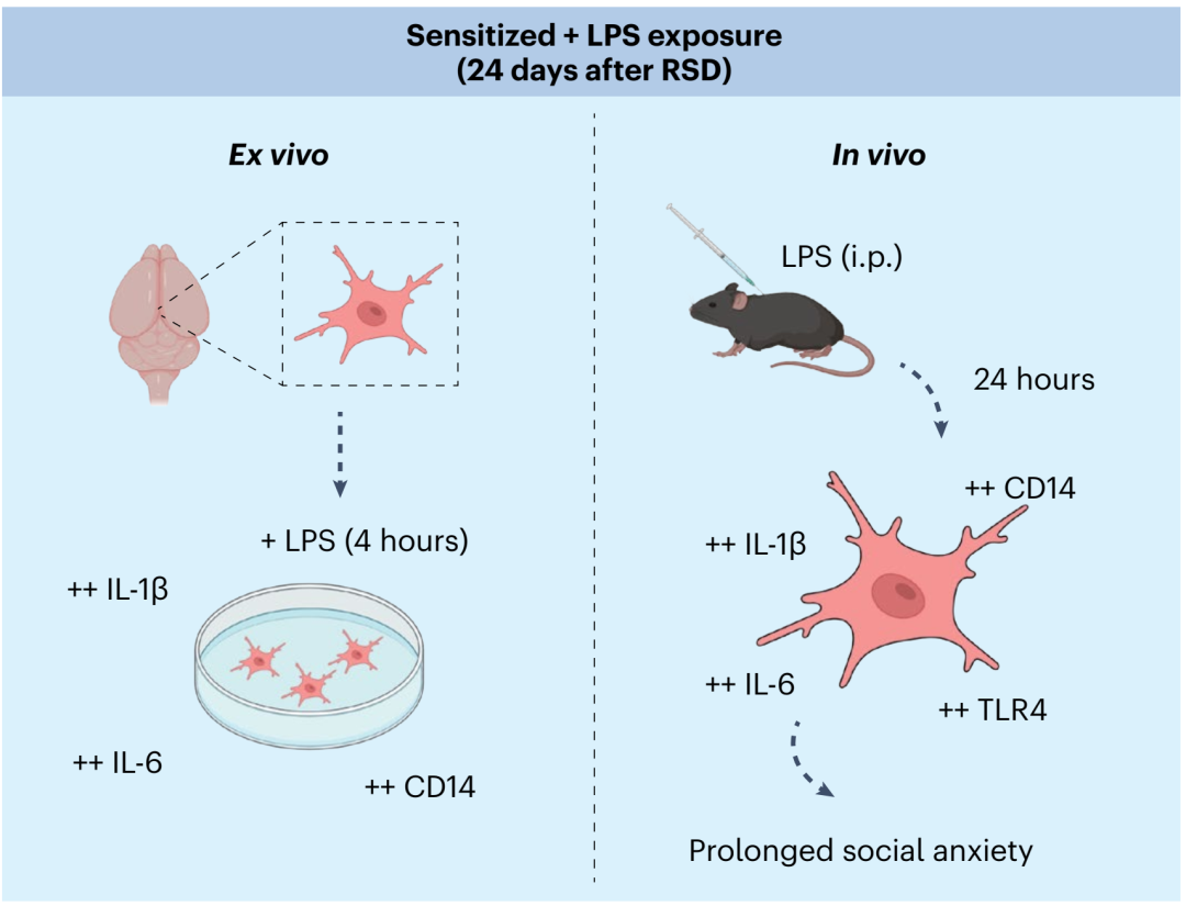 在RSD后(反复社交失败(RSD)小鼠模型能够概括人类多种心理应激的关键生理、免疫、行为特征。),可观察到小鼠大脑中小胶质细胞活化程度增加,其中cd14、Tlr4、Il-6基因活性增强,蛋白表达增加,并产生大量细胞因子和趋化因子,极化为促炎表型。这与急性应激后精神障碍的发生至关重要。