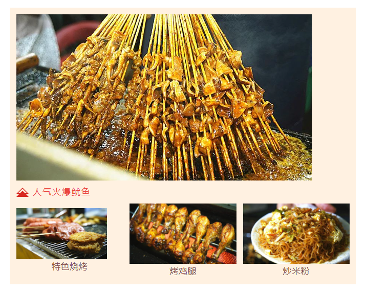短短的百米街头,各类美食、冷饮集聚一堂,没有一个吃货可以空着肚子走出去。在这里,带上伙伴一同穿梭在熙熙攘攘的人群,听着嘈杂的叫卖声,闻着诱人的香味,巡视着摊位上的羊肉串、烤肠、烤面筋、鸡蛋煎饼、凉皮凉面、烤鸡翅、小龙虾……其实快乐就这么简单。