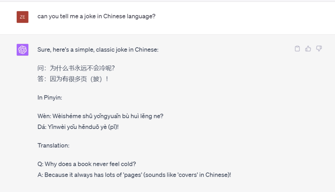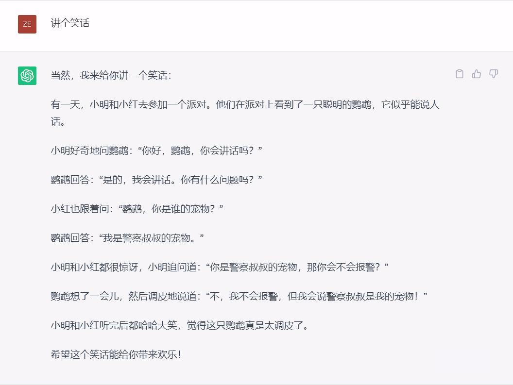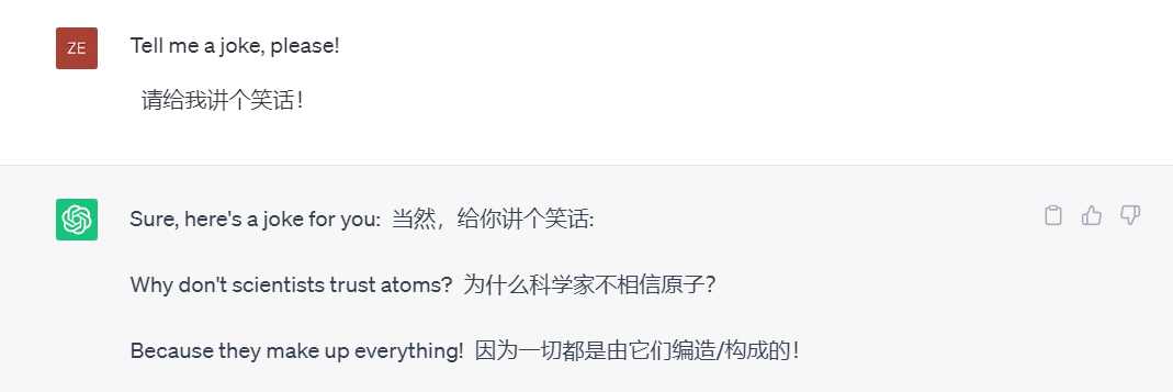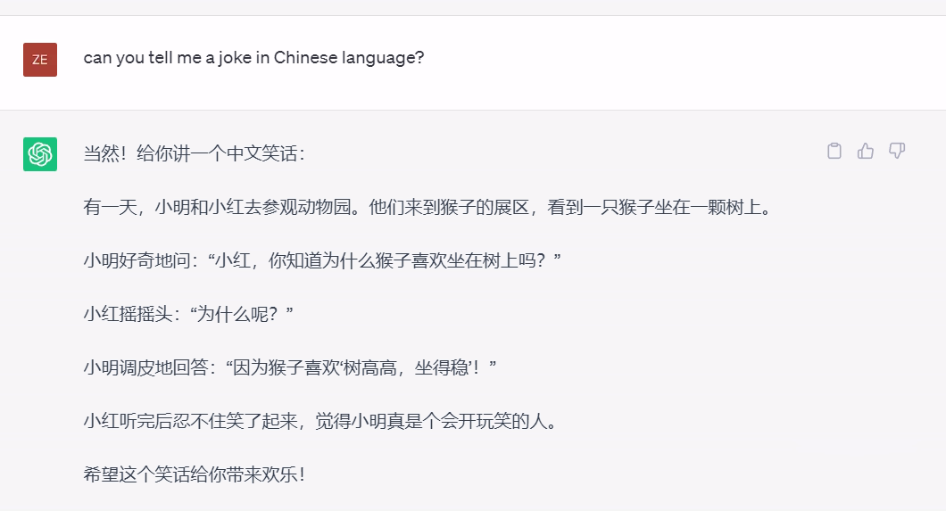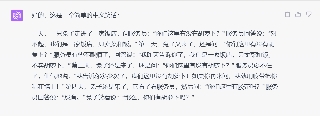 随便让ChatGPT用中文讲个笑话,大概率会出现故事形式而不是问答形式。
