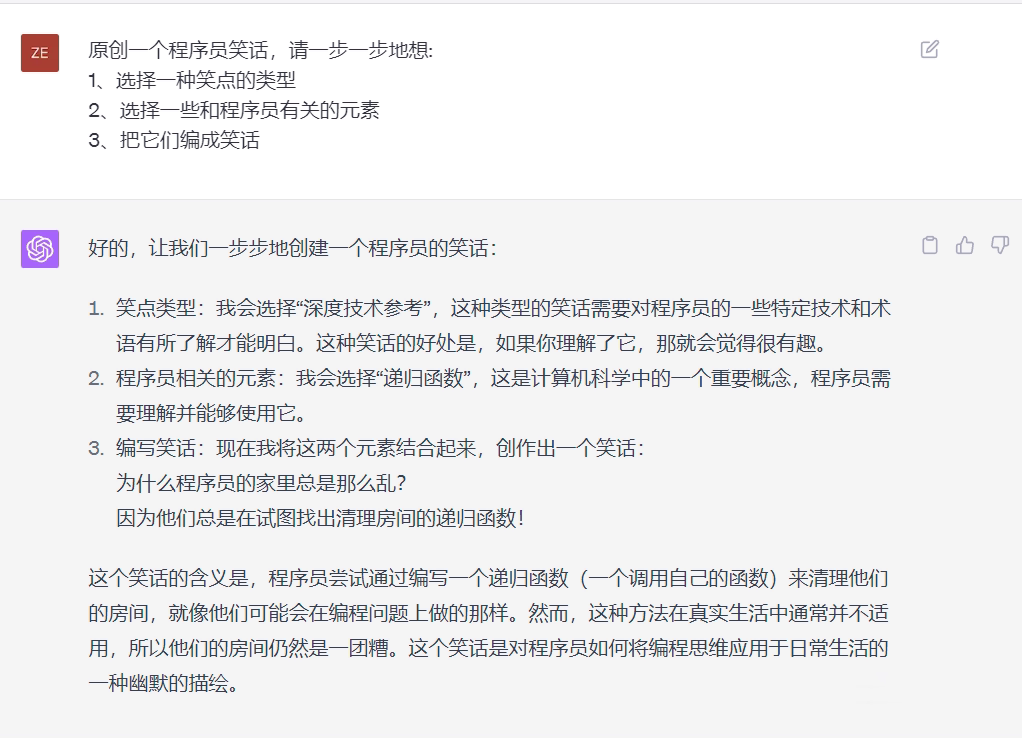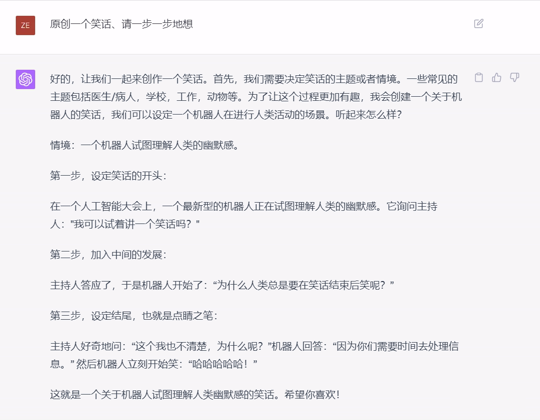 最后我们测试发现,使用思维链提示同样可以引导ChatGPT讲出一个原创的笑话。
