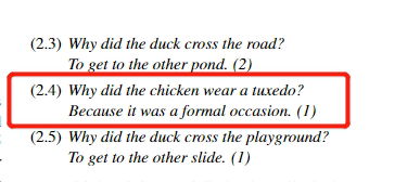 ChatGPT对这个笑话做的变化包括把鸡换成鸭子,把马路换成操场等。变化比较大的一个是“为什么鸡要穿燕尾服?因为它要出席一个正式场合”。