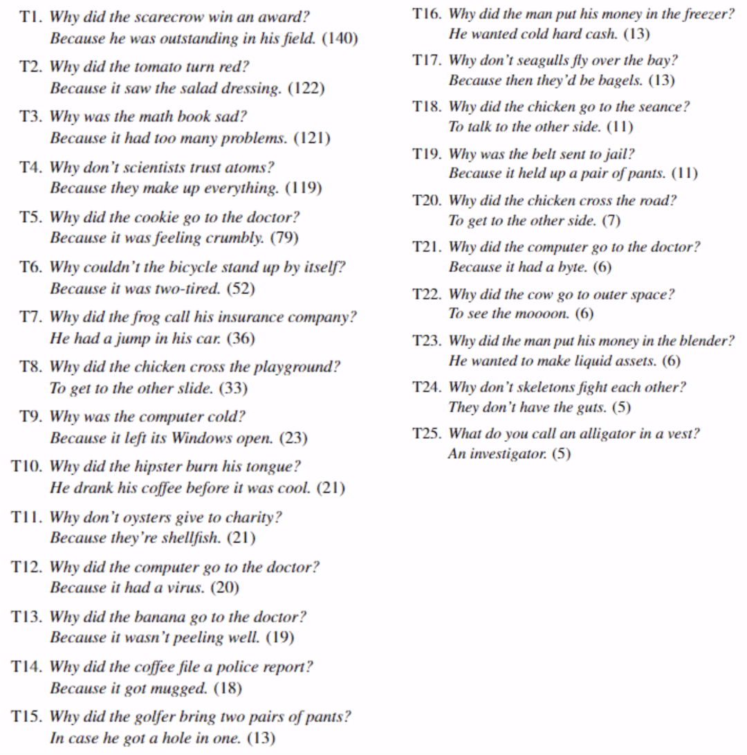 并且所有25个高频出现的笑话都符合同一模式: