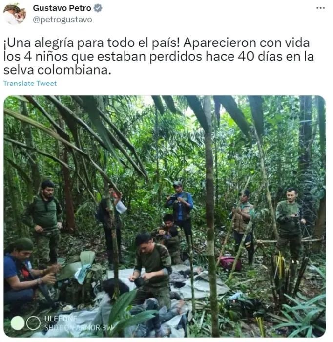 与此同时,佩特罗还在社交媒体上公布了一张照片,一群士兵带着4个孩子在丛林中。“(4名儿童被找到时)在一起,他们很虚弱,等待医生评估他们的状况。我们找到了他们,我很高兴。”佩特罗9日称,“他们是丛林之子,他们是完全独立求生的榜样,他们的传奇故事将载入史册。”